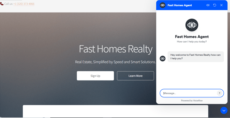 Alternatively, a customer can call the Fast Homes Realty number, where the same AI agent picks up, answers questions about listings, schedules viewings, or shares property pricing — all through a natural, human-like voice interaction.