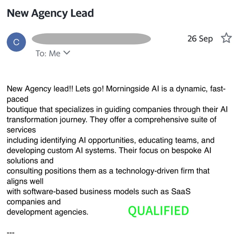 Qualified Leads: The system classifies them (e.g. SaaS or Agency), routes them to the right sales rep, and sends an email summary with key insights.